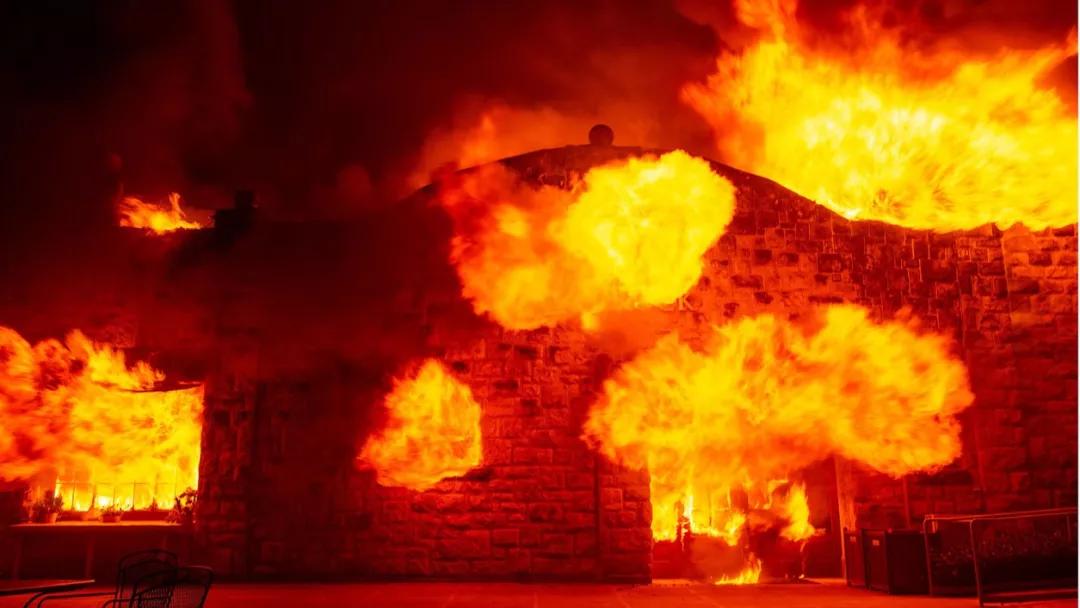这张图片不是在拍好莱坞大片,而是加州的Soda Rock 酒庄在本次加州大火中被吞噬的景象。