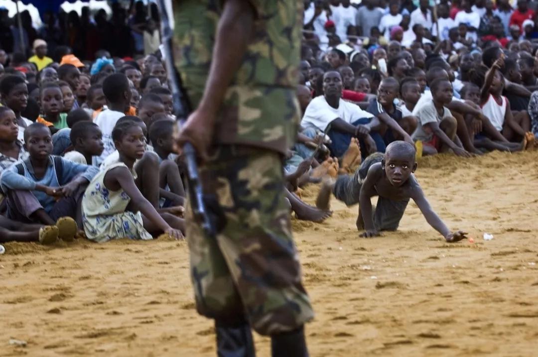 当他把镜头对准其中一名士兵的时候,在围观的人群中突然间钻出来一个小男孩,试图捡回他掉出去的球。利比里亚经历了多年的内战,这个小男孩在战争中长大,他本能地害怕士兵和他们手中的枪。他想要把自己宝贵的球捡回来,然而他的眼睛却一直紧紧盯着前面的士兵。