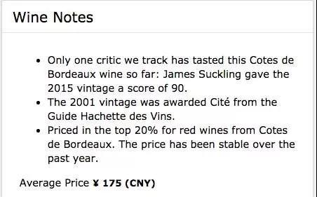 Château Lafitte酒庄位于位于法国Côtes de Bordeaux产区,由Raymond Lafitte创建于1763年。在Wine Searcher上的国际均价为175元,James Suckling曾为其2015年份的葡萄酒打了90分。