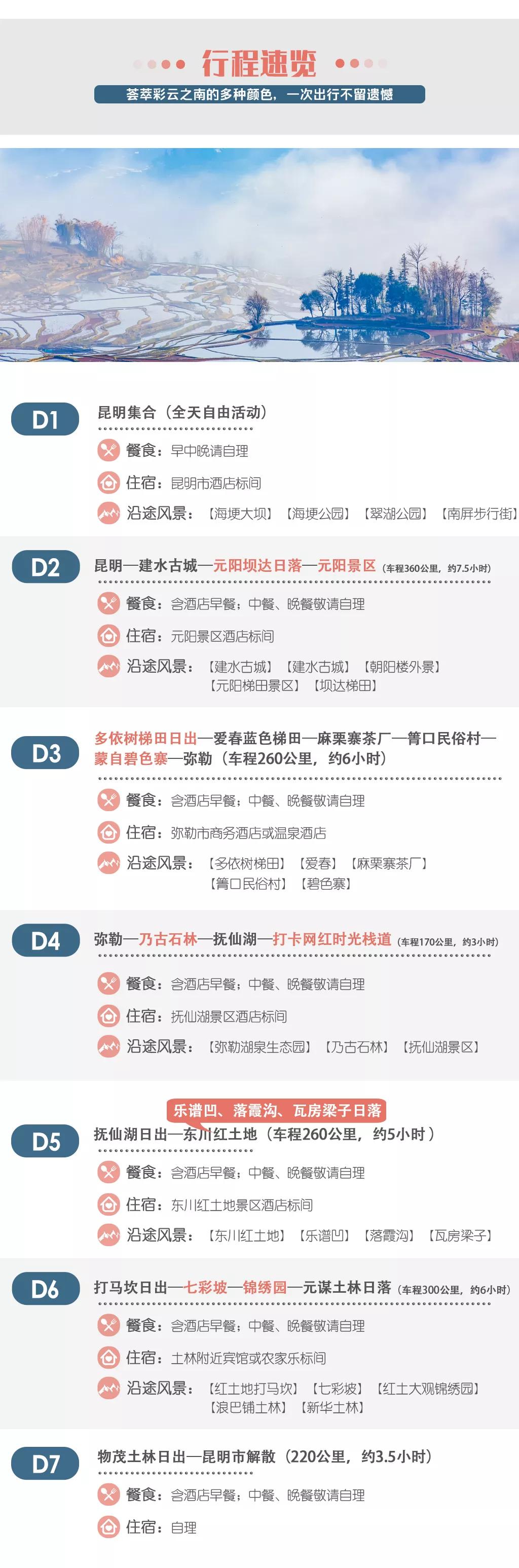 当日行程:早晨出发前往【红土地打马坎】观赏磅礴日出,之后到达【七彩坡】、【红土大观锦绣园】进行拍摄;