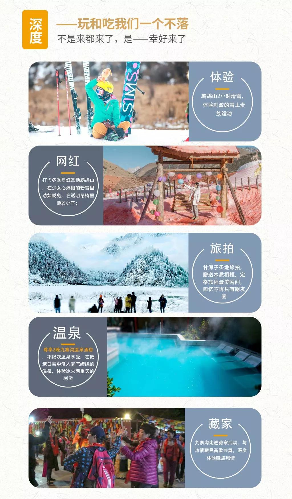 当日行程:九寨沟得名于沟内有九个藏族村寨,以“九寨六绝”——翠湖、叠瀑、彩林、雪峰、藏情、蓝冰而闻名天下。远望雪峰林立,白雪皑皑;近看碧水澄澈,清可见底;除却如梦似幻的自然景观,还有藏家木楼、晾架经幡、栈桥、磨房、藏族习俗及神话传说构成的人文景观,也因这不二的美,你能在这里见到许多热门影视剧里的取景场地。冬季的九寨沟变得尤为宁静,也更具诗情画意,山峦与树林银装素裹,瀑布变成了一幅幅巨大的天然艺术冰雕如此洁白而高雅的世界,错开拥挤的游人,却能收获一个观赏九寨六绝之“蓝冰”和“雪峰”的最好时机。