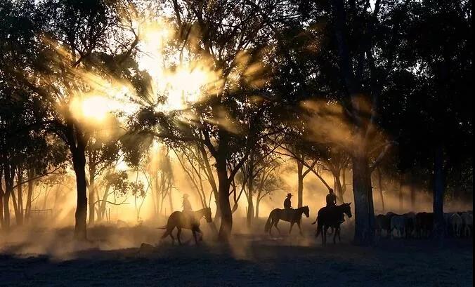 在逆光的树林里面,牛,马,羊,就是一个点