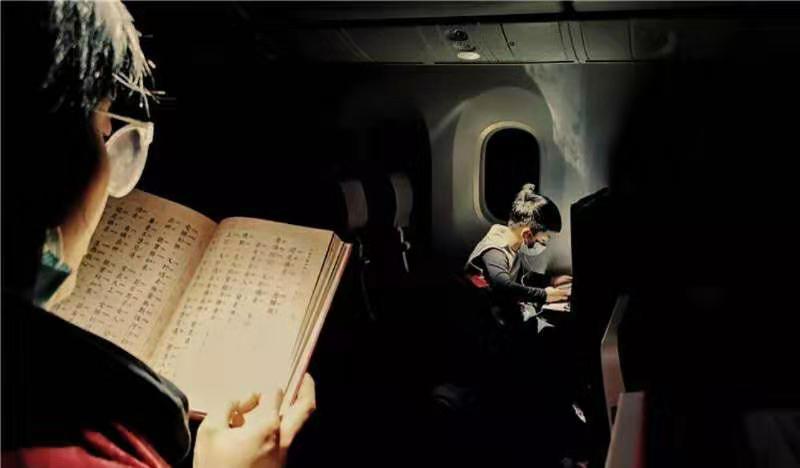 1月25日,由重庆起飞的航班上,儿子戴着口罩做作业。