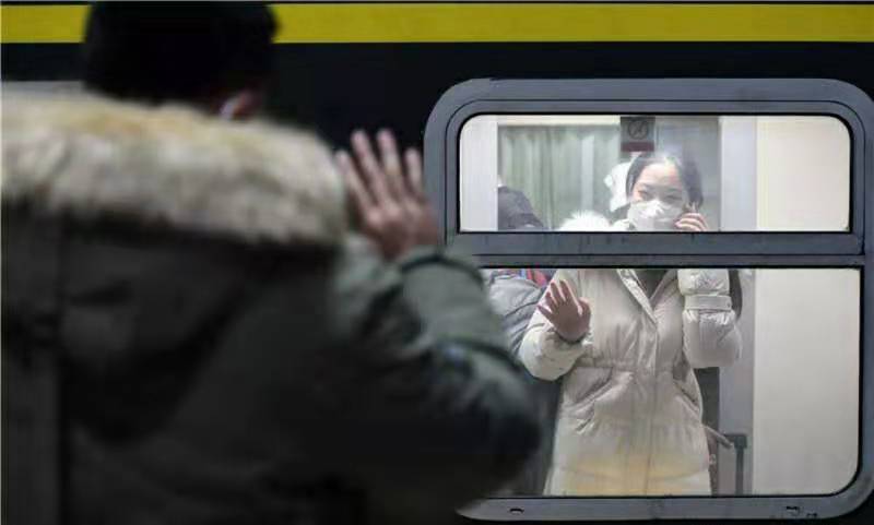 1月26日,河北省第一批赴鄂抗疫医疗队队员赵紫薇(后)在出发前与男友挥手告别。当日,由河北省卫生健康委组建的河北省第一批赴鄂抗疫医疗队从石家庄出发前往武汉,支援湖北抗击新型冠状病毒感染的肺炎疫情。这些医疗队员来自河北省10个省直医院和13个市三级医院,共150人。