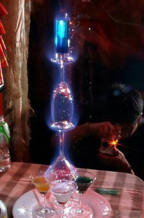 【喷火林宝坚尼】这款酒由于音译不同,也有叫兰宝坚尼的,总之都是这款酒。为什么要学会这款酒呢?看照片你便猜到一二了。酒吧里面,多聚集了年轻男女,他们平时就喜欢看好莱坞大片震撼的场面,这款酒绝对是你震撼全场的必杀技,学会它,准备接收各种各样的惊叹声吧!
