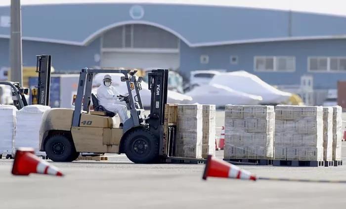 2月6日,邮轮再次补充给养。穿着防护装备的工作人员将物资卸载到船上,包括食物、淡水、药品和数字温度计等。中午时分,乘客的午餐依然有三种菜色可供选择,广播里传来“将向船舱分发口罩”的通知。