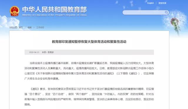 当前全国本土疫情传播已基本阻断,但境外疫情呈加速扩散蔓延态势,我国疫情输入压力持续加大。大型体育活动和聚集性活动人员集散量大、流动量大,疫情传播风险较大。日前,教育部应对新冠肺炎疫情工作领导小组办公室印发《关于新冠肺炎疫情期间暂停恢复大型体育活动和聚集性活动的通知》(以下简称《通知》),切实保障广大师生生命安全和身体健康。