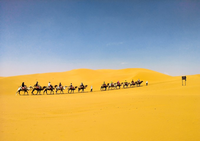 在景区内,你可以选择乘坐景交车前往沙漠区,也可以步行前往。在沙漠区之前还会路过3d玻璃桥、黄河索道、黄河蹦极的娱乐设施,充分满足了每位旅客。到沙漠区后,最先进入你视野的是一座陡峭的沙山,沙梯被掩埋在黄沙之中,如果你不想步行爬上去,也可以选择不远处的电梯上山。沙山顶部是一个宽阔的平台,在这里可以一睹沙坡头景区的全貌,尤其是如东方巨龙般的黄河,滔滔河水仿佛直通天际。平台的尽头是一个车站,每个前往沙漠地带
