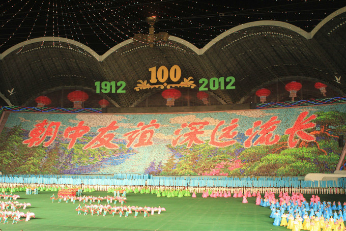 背景变换由朝鲜的小学生们手举彩色翻板组成