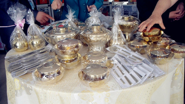 虽然朝鲜整体的生活水平不高,但在专对外国人开放的小卖部或者纪念品店,商品的价格并不低。朝鲜特色的纯铜筷子(一双)+勺子(一个),每套根据份量不同,有20元和25元人民币两种价格,一套铜碗260元人民币,40度的高丽人参酒100元人民币/瓶,一瓶朝鲜特色辣酱20元人民币,一件纪念T恤100元人民币。