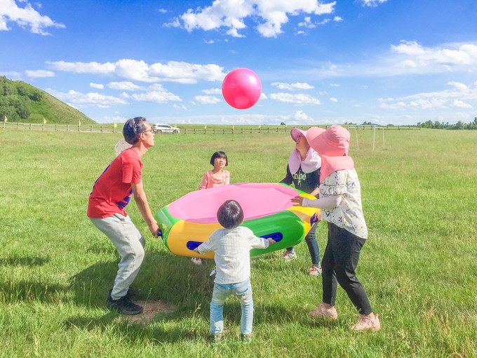 四方绿茵场,看不到边际,望不到观众席;趣味草原运动会,滑沙、拔河、袋鼠跳、鸿运彩球、碰碰球……我没想到,在没有围栏的草原踢球是这样的酣畅淋漓;我没有想到,在草原上放风筝只能感叹线不够长;我没想到,在草原还能玩这么多游乐项目。这里简直就是一个草原迪士尼,儿童的天堂乐园,甚至连大人也能在这里找回童年的乐趣。