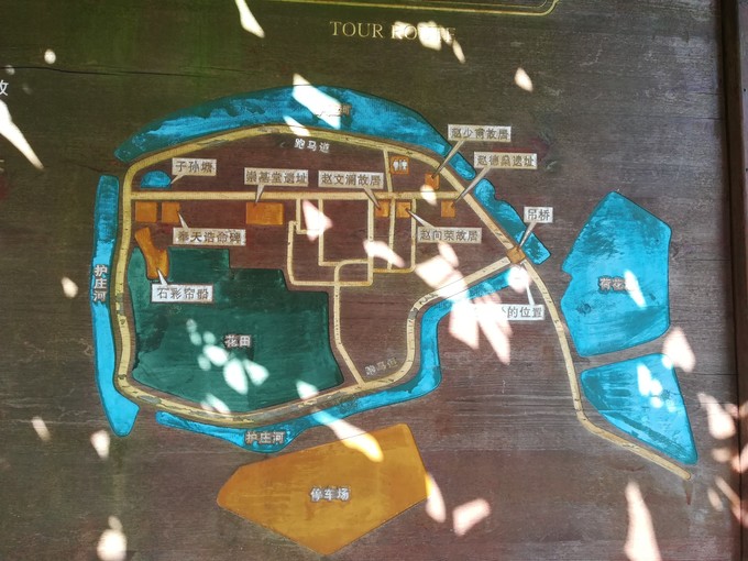 村口的全庄地图,推荐停车在庄门,庄门进庄门出,幸存古屋集中在中心巷道东侧,南边主要是花田。