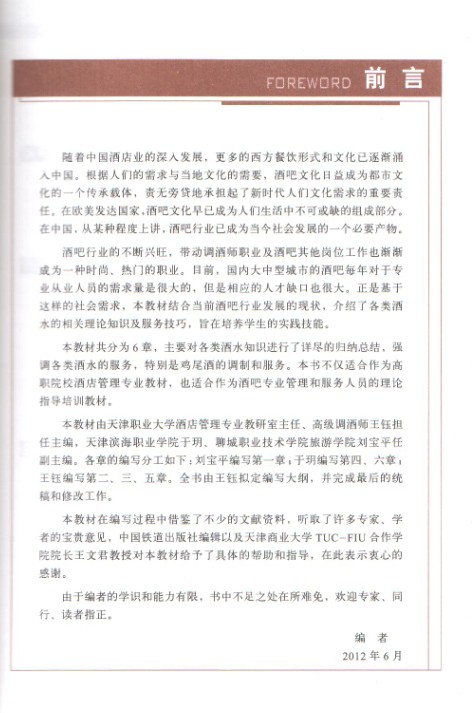 【网宣部】“全国优秀导游员”/国家级“高级调酒师”刘宝平继参编教材《旅行社经营管理》出版后,副主编教材《酒水知识与服务技巧》于2012年10月出版,本教材结合当前酒吧行业发展的现状,介绍了各类酒水的相关理论知识及服务技巧,旨在培养学生的实践技能。教材共分为6章,(刘宝平编写第一章),主要对各类酒水知识进行了详尽的归纳总结,强调各类酒水的服务,特别是鸡尾酒的调制和服务,本书不仅适合作为高职院校酒店管理专业教材,也适合作为酒吧专业管理和服务人员的理论指导培训教材。