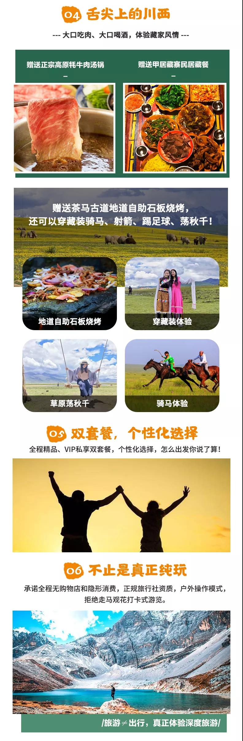 赠送:特色赠送甲居藏寨藏家晚餐、高原特色牦牛汤锅、理塘茶马古道自助石板烧烤;赠送旅游三宝、魔术头巾、矿泉水缓解旅途疲劳;赠送价值98元圣地旅拍精致木质相框&照片;赠送稻城专业摄影师现场教学夜拍星空直出大片,没有星星时则教拍流光大片;15人以上赠送甲居藏寨篝火晚会;赠送成都市区24小时接机/接火车服务;赠送项目不用不退。