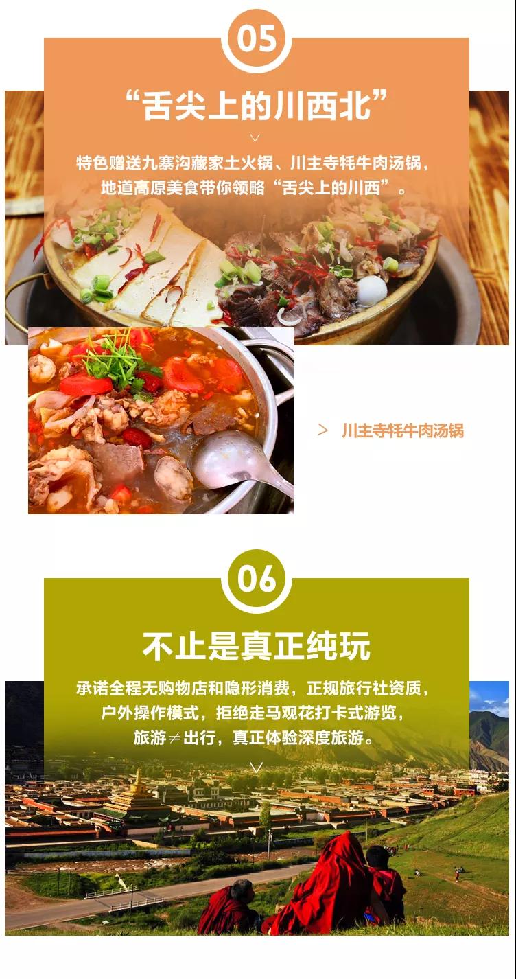 用餐:含早餐,晚餐赠送九寨沟走进藏家藏式土火锅;午餐敬请自理