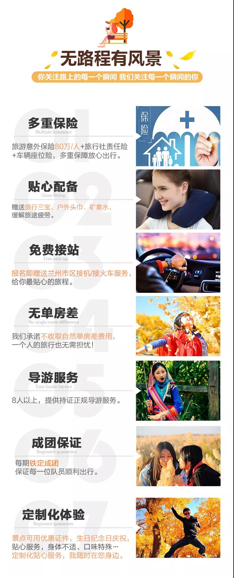 接站服务:3人以下的客人抵达兰州可自行打车前往指定酒店,打车费用可报销30元/人;3人及以上的客人抵达兰州可提供兰州市区拼车接机/接火车服务,接机/接火车的工作人员会在您出发日期前一天21:30之前向您推送消息并与您联系,如果超过时间没有接到任何通知,请及时与导游或报名处联系。(节假日用车人数较多情况下客人等待时间可能会延长;我方会安排临近航班拼车接机接站,如遇其他客人航班火车延误晚点情况,等待时间可能会延长,敬请谅解)