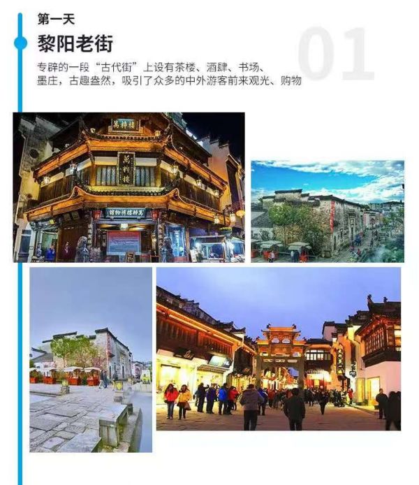 到达黄山市后自由逛黎阳老街:今黄山市屯溪区黎阳镇的旧时街市,与屯溪老街隔江相望。屯溪老大桥(原名镇海桥)作为他们之间的唯一通道横跨其间。老大桥往南,走过一座横跨在名为河底溪的小溪上的西镇桥就是黎阳老街。大部分旧宅不复存在,但依然留下了具有徽州传统风格的徽派民居数座及民国石库门风格的老宅。 老屯溪人代代相传的俗语“明清个屯溪,唐宋个黎阳”,它隐隐地告诉了我们黎阳在昱城人心中的分量。