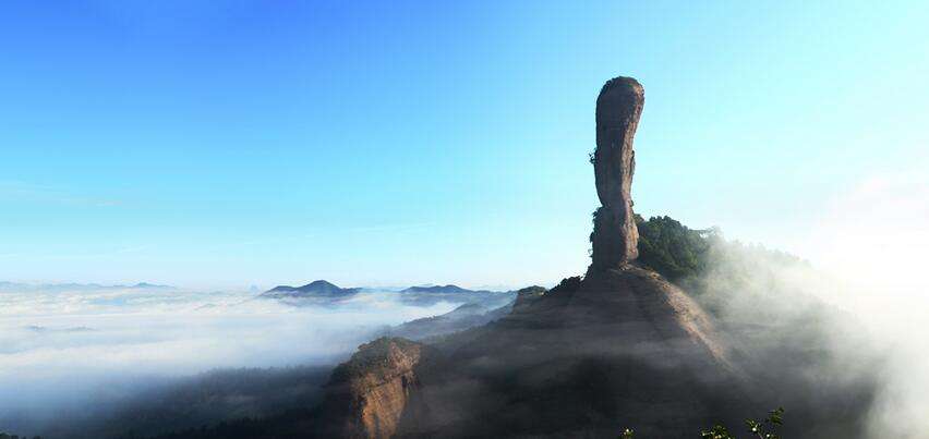 早上7:00出发赴棒槌山,预计7:20到达。拍摄棒槌山的独具风采的美景。颇为奇妙的是,磬锤峰半腰长着一株高约3米的桑树,据测这株桑树与磬锤峰相亲相爱已经三百年了,据传为我国最早之桑树。峰下有一平台,东面断崖有清代密宗雕像。