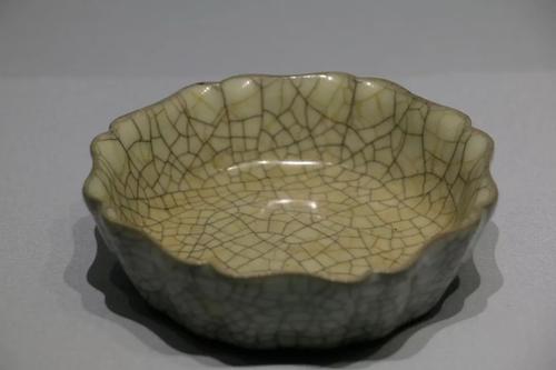 发生损坏的宋代哥窑青釉葵瓣口盘呈六瓣葵花式,通体施青灰色釉,釉面开细碎片纹。圈足露胎处呈黑褐色。此盘造型优雅、大方;线条富于变化,为宋代哥窑的代表作品。