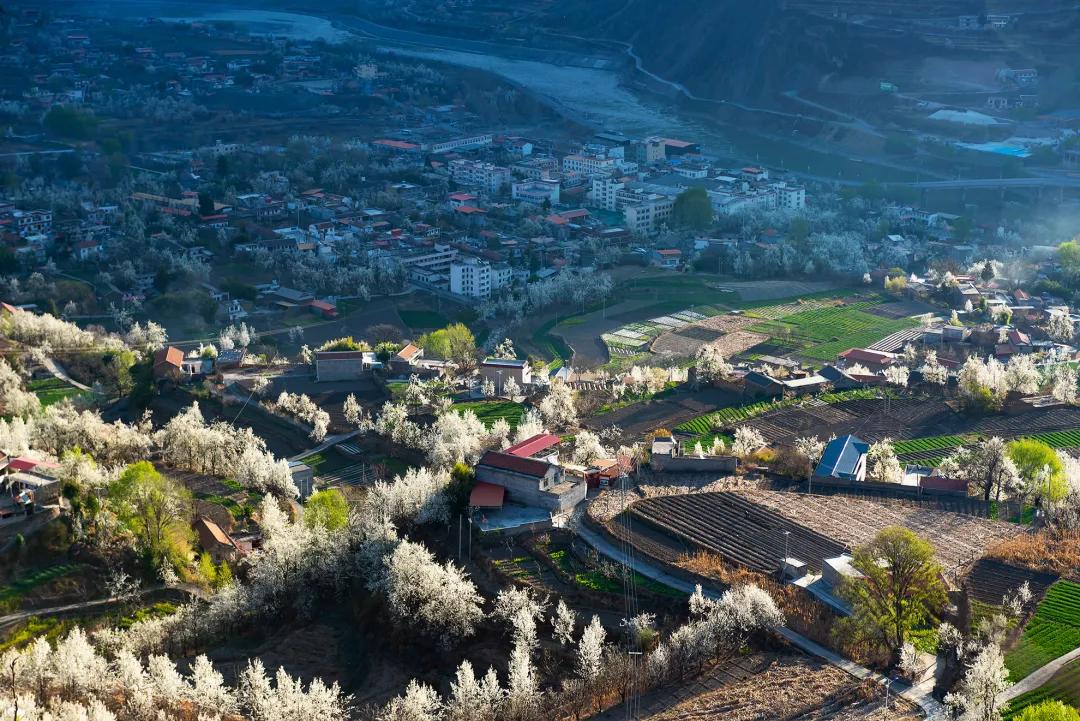 我们的团期是金川最好的时节,万物复苏的初春三月,正值金川成千上万棵梨树花期,雪白色的梨花竞相开放,一片片、一层层的铺散开来,漫山遍野的白色花海中夹杂零星新绿,空气中氤氲着梨花清香,眼是天堂,身亦是天堂。