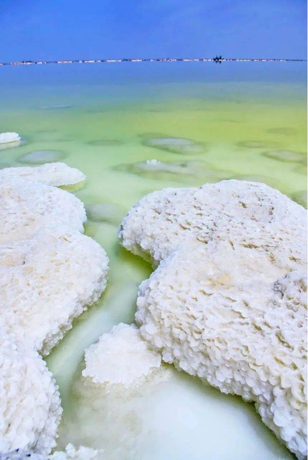因为气候炎热干燥,湖水的蒸发量远远高于降水量,湖内便形成了高浓度的卤水,然后逐渐结晶成了盐粒。而盐花是盐湖中的盐结晶形成的特殊形状的结晶体,由于结晶时的温度,气候,时间长短,浓度不同等原因,形成了各式各样,万千变化的美丽盐花。生命的禁区,万物俱寂,但是唯有“盐花”开的最旺,它就是大自然赐给人类的绝妙作品,日夜看守这片净土。这些盐花无需人工的雕琢,形态各异,有的宛如贝壳,有的宛如楼台,一丛丛,一片片,一簇簇地立于盐湖中,把盐湖装饰得如仙境一般。