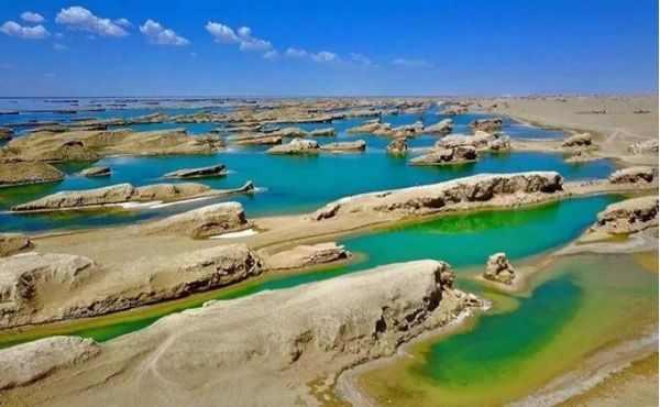 走在这里,你还可以看到鬼斧神工的“水上雅丹”,在阳光的照耀下湖水波光粼粼,同远处的沙丘形成了一幅美丽动人的绝世画卷,那种让人心神摇曳的美可能无法用语言准确的描述,只有身临其境才能真正的体验到何谓旷世奇景。