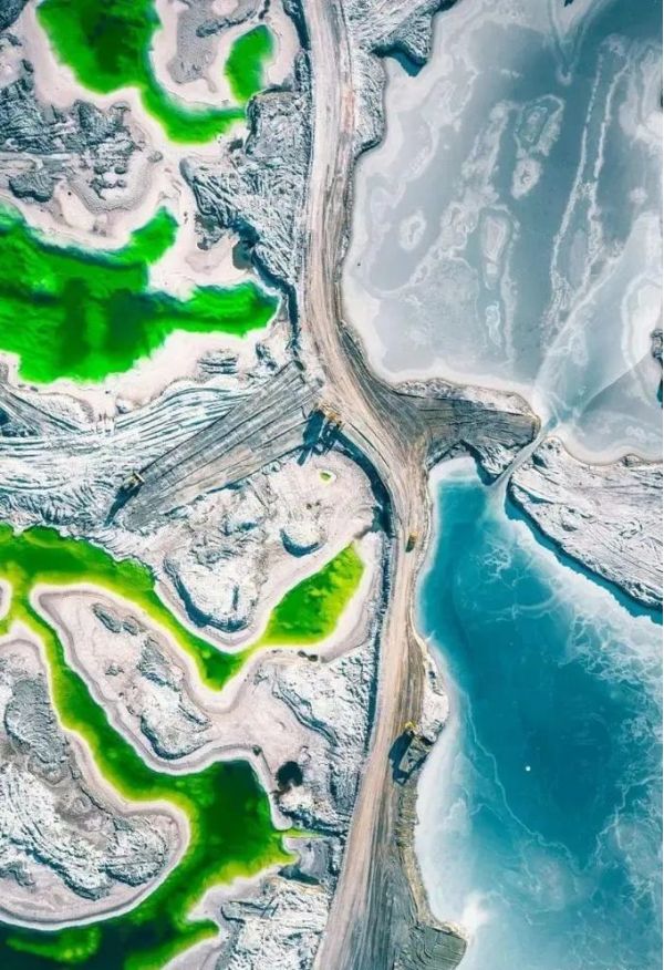 东、西台吉乃尔湖,在一条狭长的棕黄色盐碱土路两侧,呈现出一边碧绿,一边青翠,截然相反的绝美水色。