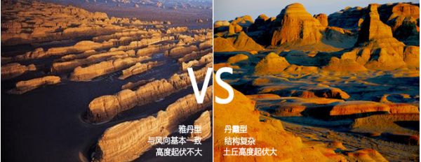 这里我先给大家po上两个名词解释。雅丹—维吾尔语译名,指风力吹蚀未固结、较松散的河流和湖泊沉积物而形成的一些“陡峭的土丘”,在干旱区分布广泛;丹霞—是经由地壳抬升后,由流水、风化和重力等作用塑造而成,“顶平、身陡、麓缓”,岩性坚硬,年代远比雅丹古老。