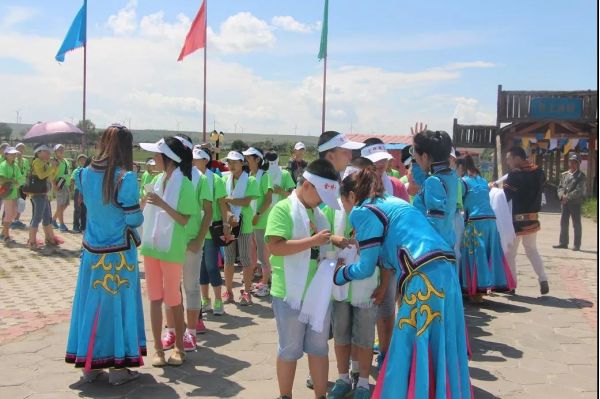 下午:来到了美丽的安固里草原,蒙古族小伙和姑娘们载歌载舞,为营员献上洁白哈达,递上蒙古欢迎礼节 “下马酒”。