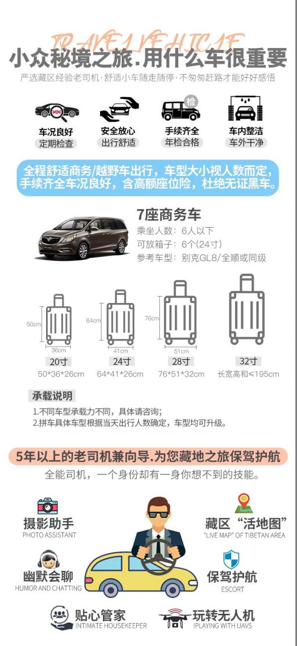 2、交通 :2-6人VIP私享小团,全程舒适越野车/商务车出行,车型大小根据实际人数安排,保证一人一正座位,且由驾驶经验丰富的司机为您的出行保驾护航,报价包含车费、油费、停车费、维修费及司机劳务费。