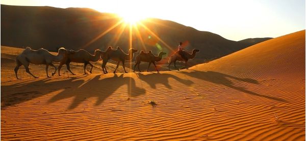 2、探寻中国最美的「巴丹吉林大沙漠」,拍摄驼队在落日的沙漠中旖旎而行,日出日落时美丽的沙漠光影线条;