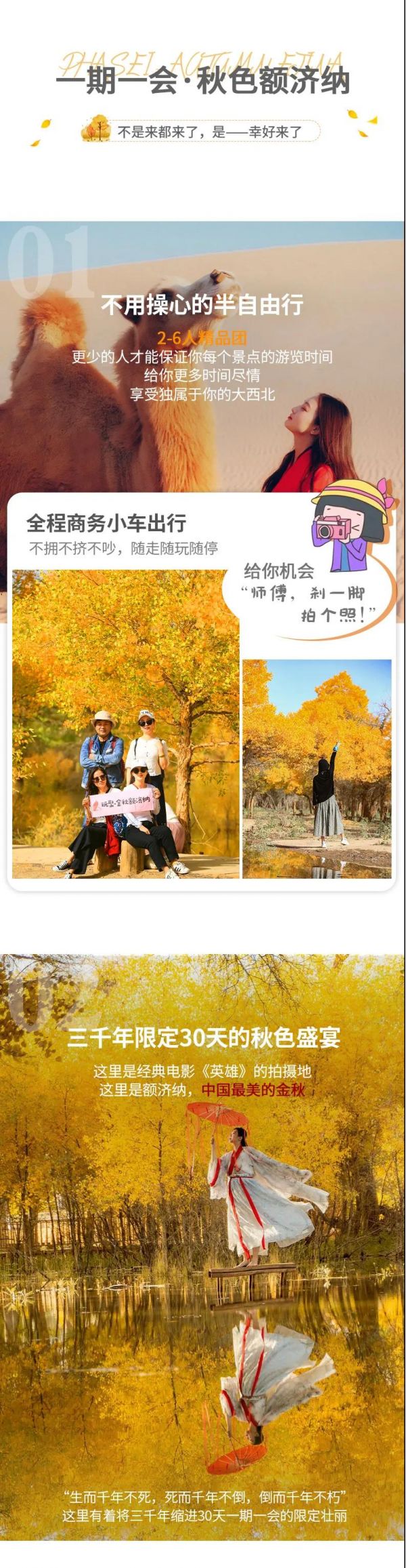 在额济纳旗胡杨林核心景区,我们还精心安排了驻地专业摄影师旅拍,每人至少3张旅拍精修电子大图,将这绝美秋色与最美的你定格永存。