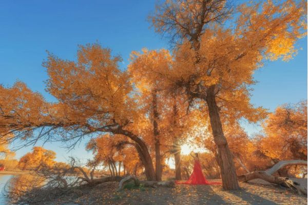 4、穿戴合适的服饰:衣饰最好选择纯色为主(红色、白色等),以纱质/丝质披巾为主,突出人物色彩。今天大家可以穿一些红色、蓝色、白色的衣物,搭配胡杨林的漫天黄叶,十分漂亮。