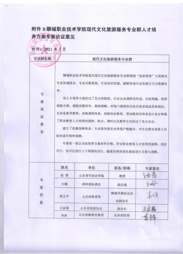 附件3:聊城职业技术学院现代文化旅游服务专业群人才培养方案专家论证意见