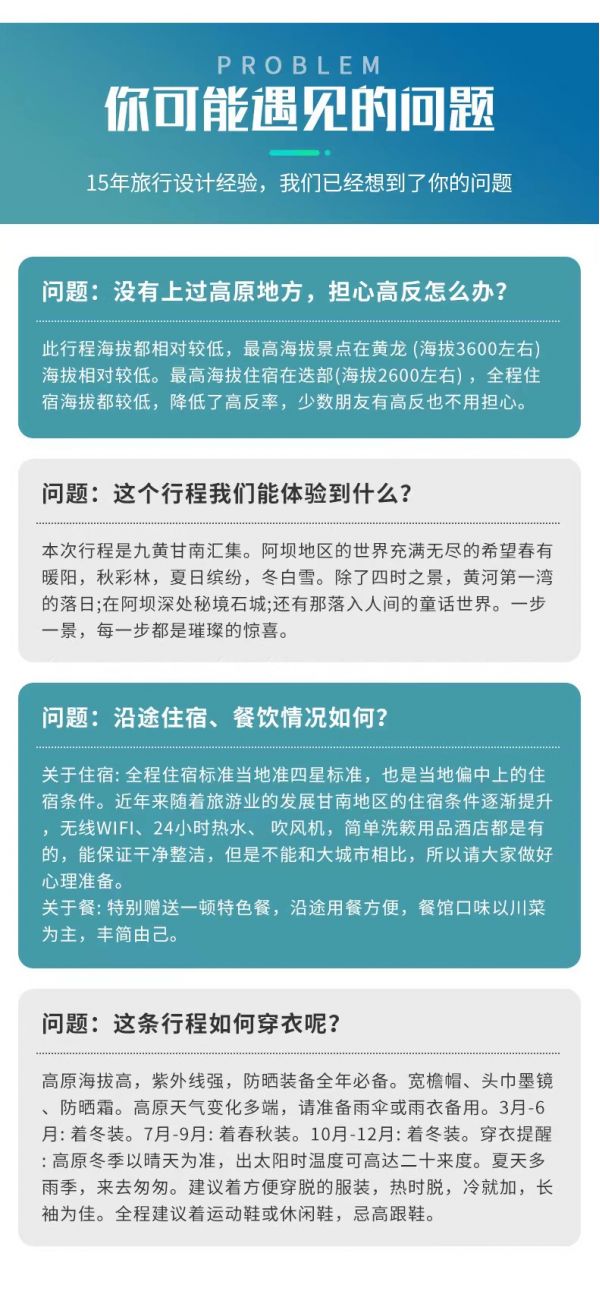 请对应使用我方九寨甘南7日自由VIP小团行程,因使用其它行程造成的投诉,责任自负;请仔细阅读以上行程文档,同意并保证遵守我方安排,以免为您带来不必要的麻烦;如产生合同纠纷或人身意外事故,按《中华人民共和国合同法》、《道路交通法》、《保险赔偿条例》裁定;本行程作为旅游合同附页与旅游合同同等法律效力。