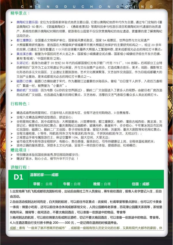 成都-重庆双飞6日游 聊城发团 纯玩 无购物 大熊猫基地 川菜博物馆 南桥都江堰景区 灌县古城西街 黄龙溪 锦里 奥陶纪云端廊桥 玻璃吊桥 悬崖秋千 步步惊心 千年寒冰洞及市区网红民国街 磁器口 鹅岭二厂文创园 李子坝轻轨穿墙 皇冠大扶梯 洪崖洞 发团日期 20230616 20230626 价格 4790 报名电话 0635 8681234