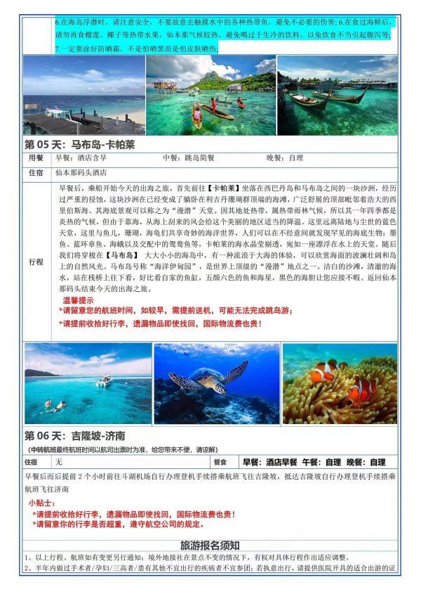 仙本那纯玩6日游 聊城发团 纯玩 无购物 马达京岛 汀巴汀巴岛 邦邦岛 马布岛 卡帕莱浮潜 ...... 发团时间 20230615 20230706 20230726 价格 8999 9999 10999 报名电话 0635 8681234