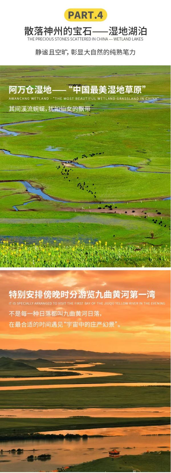 继续行程,我们将来到“中国最美湿地草原”——【阿万仓湿地】,这片湿地卧在甘肃省南部黄河的臂弯里,黄河自西向东从青海久治进入玛曲木西合,因水泻不畅而形成很多汊河和沼泽,使这片广袤的草原水草丰茂、牛羊肥壮。这里地处偏远,但也正因他的闭塞,才造就了这片世界遗落的草原的幽美浩瀚,弯曲的河流,登上观景台,俯瞰一望无垠的阿万仓湿地,散落的牦牛、洁白的羊群在茵茵草场上星罗棋布,沼泽在阳光下泛着粼粼光波,如同一帧静止的电影画面,闲逸至极。从阿万仓湿地驱往阿坝的途中我们会途经桑科草原,解锁车观桑科草原的新视角、新体验。