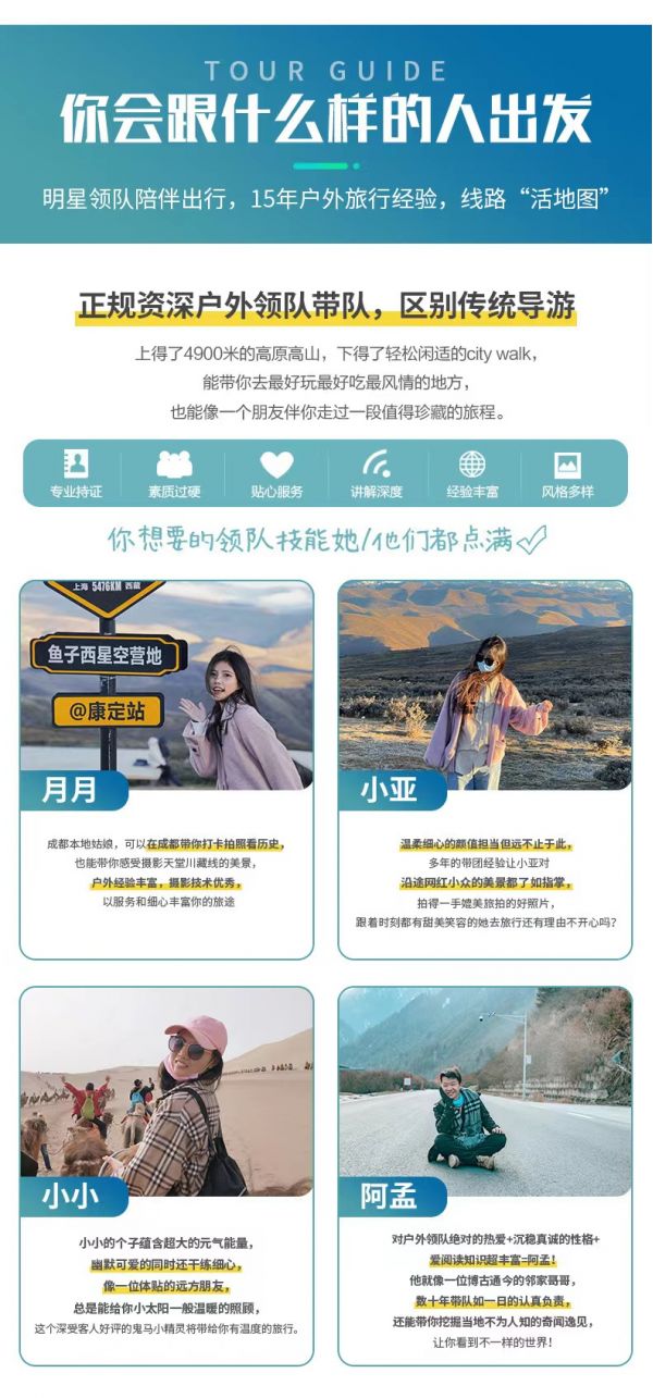 服务:8人以上提供正规持证专业户外领队服务;8人及以下由经验丰富的司机提供向导服务。