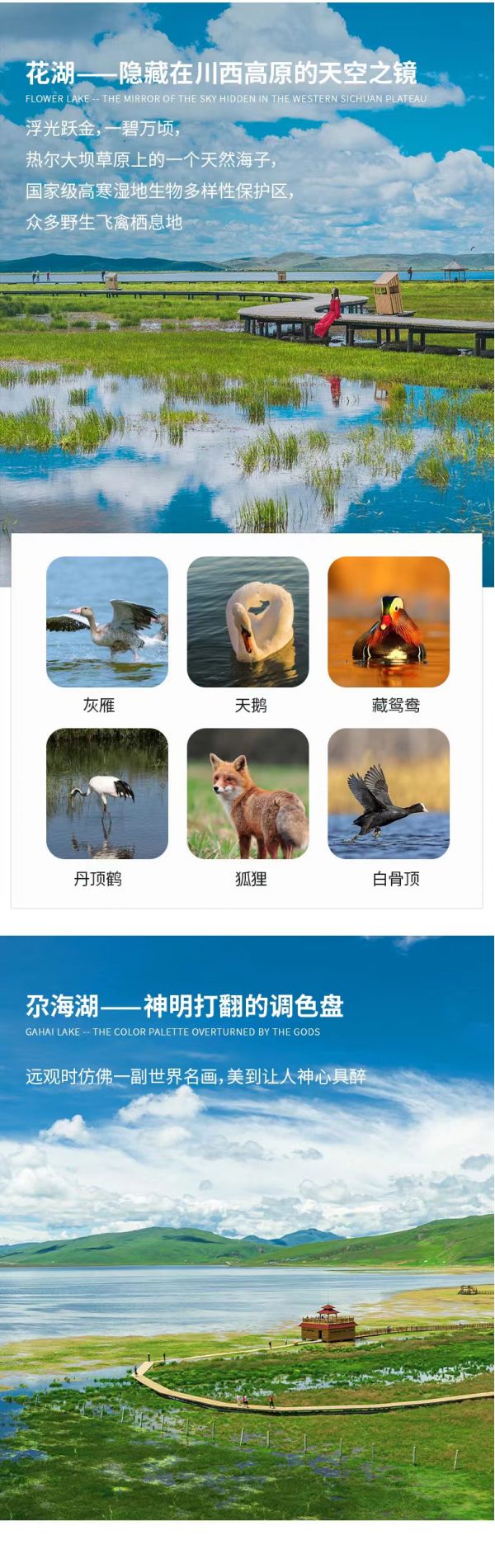 然后我们前往草原湖泊【花湖】。在仅次于呼伦贝尔草原的热尔大坝草原之上,有一个绝美的天然海子---花湖。花湖湿地属于国家级高寒湿地生物多样性保护区,是众多野生飞禽的主要栖息地,如灰雁、白骨顶、天鹅、黑颈鹤、丹顶鹤、藏鸳鸯、狐狸等。花湖的夏天和秋天别有一番风味。夏天,号称“天空之境”的花湖,周边开满野花,美轮美奂。秋天,广阔的草原变成一片金黄,蓝色的花湖被包围其中,仿佛金色地毯上的一颗蓝宝石。湖边建有木质栈道,一直延伸到水中,可以沿着栈道走到湿地深处,沿途都可以找到拍大片的好角度。