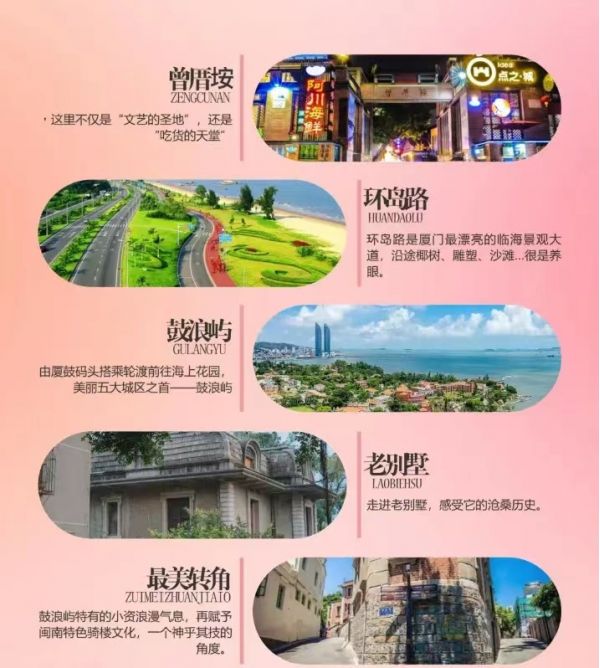 曾厝垵:山河远阔,人间烟火!曾厝垵就坐落在厦门的环岛路上,它从一个质朴的临海渔村缓缓蜕变成了如今诚意满满的文化创意村。繁华背后,也依旧坚守着骨子里的韵味。在这里,你可以泡一壶清茶,坐在木制的老藤椅上,头顶是穿过瓜果藤架稀疏散落的阳光,在都市的忙碌中享受片刻的安静舒缓。曾厝按回响的旋律点亮了迷离的夜色,这里没有鼓浪屿的嘈杂,没有市区的繁华,也没有一波接一波的游客,有的只是质朴的民居和文艺小清新的店面,当然,还有不混乱的酒吧。如果说选一个值得留念的地方,那想一定会是它——曾厝垵。晚餐可在曾厝垵自行品尝各种特色小吃。