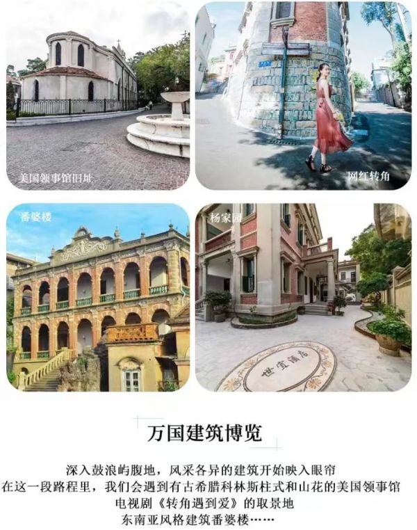 网红打卡拍照点:①「最美转角」②「晓学堂·虫洞书店」③「协和礼拜堂」④「天主教堂-万国领事馆建筑博览」⑤「怡园-林鹤年故居」