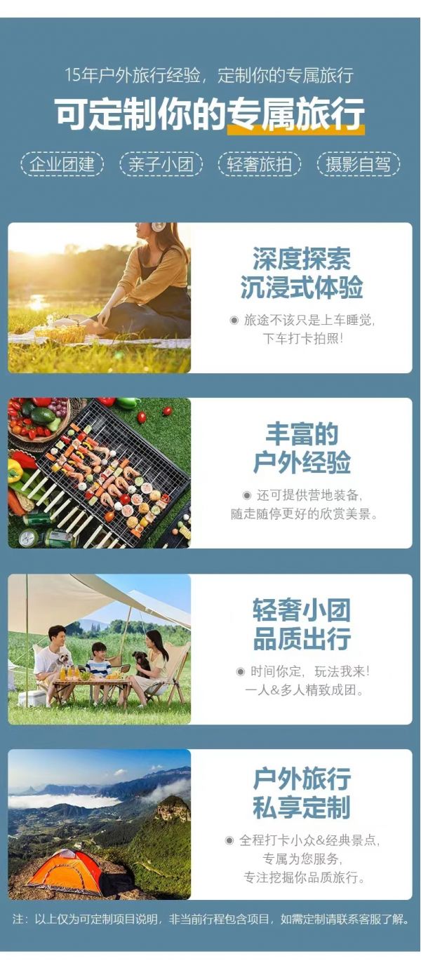 私人订制:我们业务范围囊括了全国各大城市,川西、西北、新疆、西藏,在路上永远有我们的身影。我们将为每一个有定制需求的你策划出独属于自己的完美旅行。