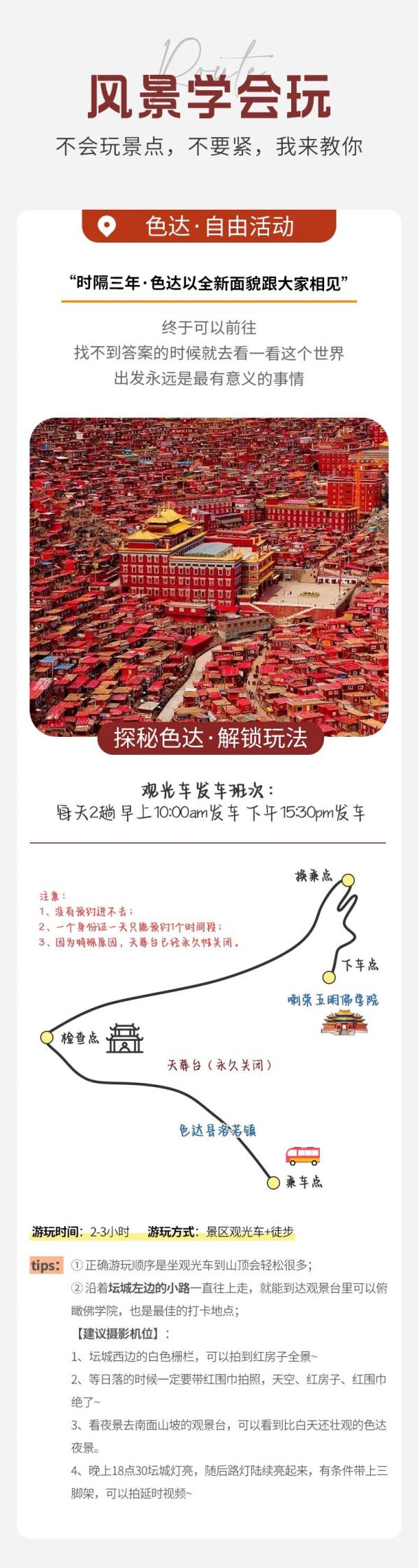 ①色达均是预约进入,统一观光车参观游览。