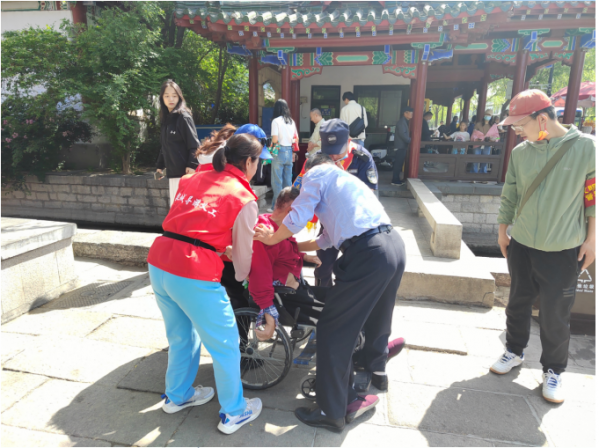 在人流量较大的地点,他们主动协助景区维护游览秩序和安全,确保游客们能够安全有序地游览。同时,他们还向游客们