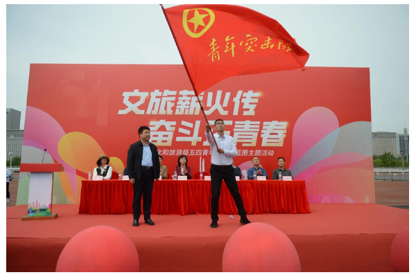 共青团济南市委副书记林鸣为市文化和旅游局青年突击队授旗。突击队员代表表示,今后要大力弘扬“艰苦奋斗、锐意创新、团结奉献、勇领先锋”的现代青年突击队精神,积极投身到全市各项文旅工作当中,充分展现青年担当。
