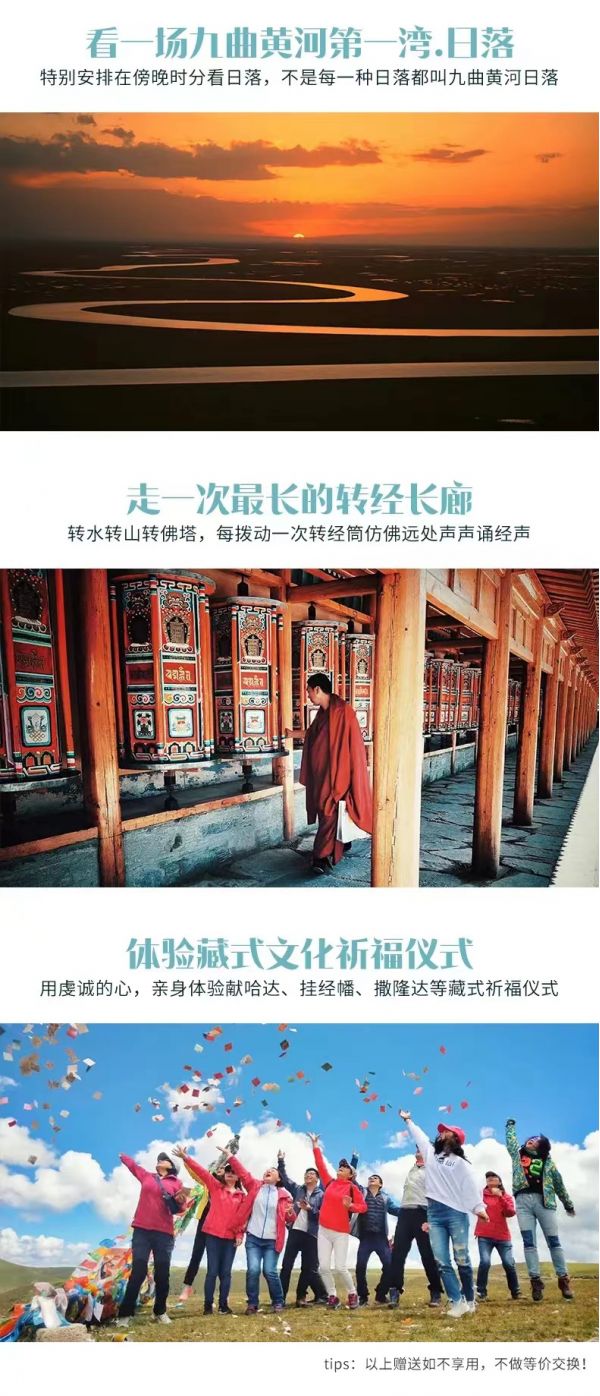 继续往前【拉卜楞寺】,有“世界佛学院”之称的【拉卜楞寺】。拉卜楞寺是藏传佛教格鲁派六大宗主寺之一 , 规模仅次于布达拉宫,是藏传佛教格鲁派最高佛学学府之一,被世界誉为“世界藏学府”,相当于我们眼中的“清华北大”。在漫长的发展中拉卜楞寺形成了独特的藏传佛教文化,包括建筑、学院、法会、佛教艺术、藏经等,曾经是甘、青、川毗邻地区藏族的政治、宗教、文化中心。在学院堪布的带领下来,进入寺院,欣赏美丽的壁画、唐卡,精美佛像;走过朱红玄黄长廊,和喇嘛一起拨动转经筒;在这红白相间的宏伟寺院中,看虔诚的信徒磕着等身长头来此转经;与僧人一起听经、打坐,静静感受这份信仰的力量。而后经过【玛曲】,母亲河黄河这里自西南入境,复从西北出境。