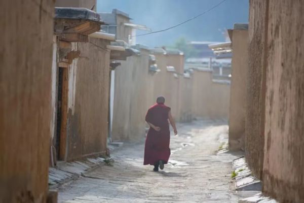 接着我们整装出行前往【郎木寺】。郎木寺是一座风情小镇,在四川和甘肃两省的交界处,周围被草原、树林、山丘、红色的石崖围绕,环境优美,是许多信教徒心中的朝圣圣地。一条小溪从镇中流过,虽宽不足2米,名“白龙江”。溪北是甘肃的“赛赤寺”,南岸属四川若尔盖县的格尔底寺,中间夹着回族的清真寺,两个藏传佛教的寺庙在这里隔江相望。一条小溪融合了藏、回两个和平共处的民族,喇嘛寺院、清真寺各据一方地存在着,你有你的晒大佛,我有我的做礼拜,小溪两边的人们各自用不同的方式传达着对信仰的执著。