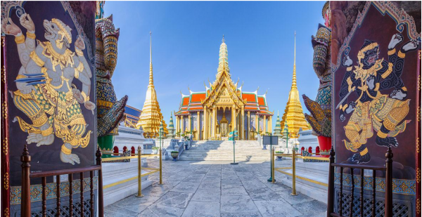 【大皇宫+玉佛寺】(皇宫+玉佛寺不少于 1.5 小时),又称大王宫,是泰国(暹罗)王室的皇宫。紧邻湄南河,是曼谷中心内一处大规模古建筑群(计 28 座),总面 积 218400 平方米。大皇宫始建于 1782 年,经历代国王的不断修缮扩建,终建成现 在这规模宏大的大皇宫建筑群,至今仍金碧辉煌。大皇宫是仿照故都大城的旧皇宫 建造的,大皇宫是泰国诸多王宫之一,是历代王宫保存最完美、规模最大、最有民 族特色的王宫。玉佛寺位于曼谷大王宫的东北角,是泰国最著名的佛寺,也是泰国三大国宝之一。玉佛寺是泰国佛教最神圣的地方,是查库里王朝的守护寺和护国寺,建于 1782 年的玉佛寺是泰国大王宫的一部分,面积约占大王宫的 1/4。玉佛寺是泰国王族供奉玉佛像和举行宗教仪式的场所,因寺内供奉着玉佛而得名。