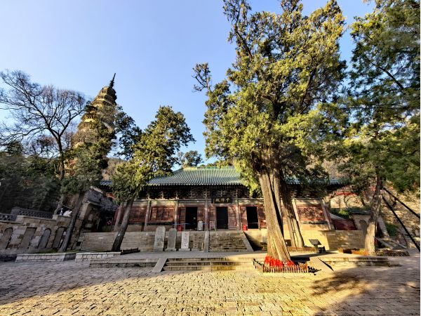 穿过千佛殿,辟支塔的身影在苍松翠柏间傲然挺立。这座11层的楼阁式砖塔高约54米,塔身雕饰精美,每层都有错落有致的门窗和栏杆,塔顶的相轮宝盖在阳光下熠熠生辉。